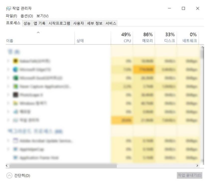컴퓨터를 사용할때 유독 CPU 점유율이 높거나 메모리를 많이 차지 하는 프로그램은 잘 살펴보고 자주 쓰는 파일이 아니라면 틈틈이 지워주세요.